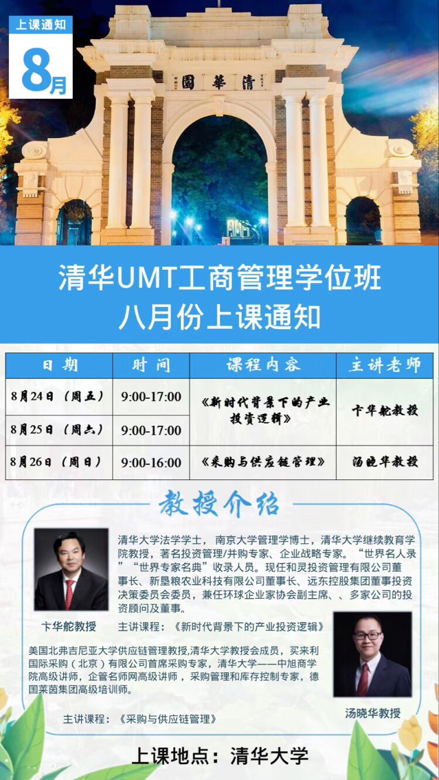 UMT工商管理学位班清华园教学中心2018年8月份上课通知如下: