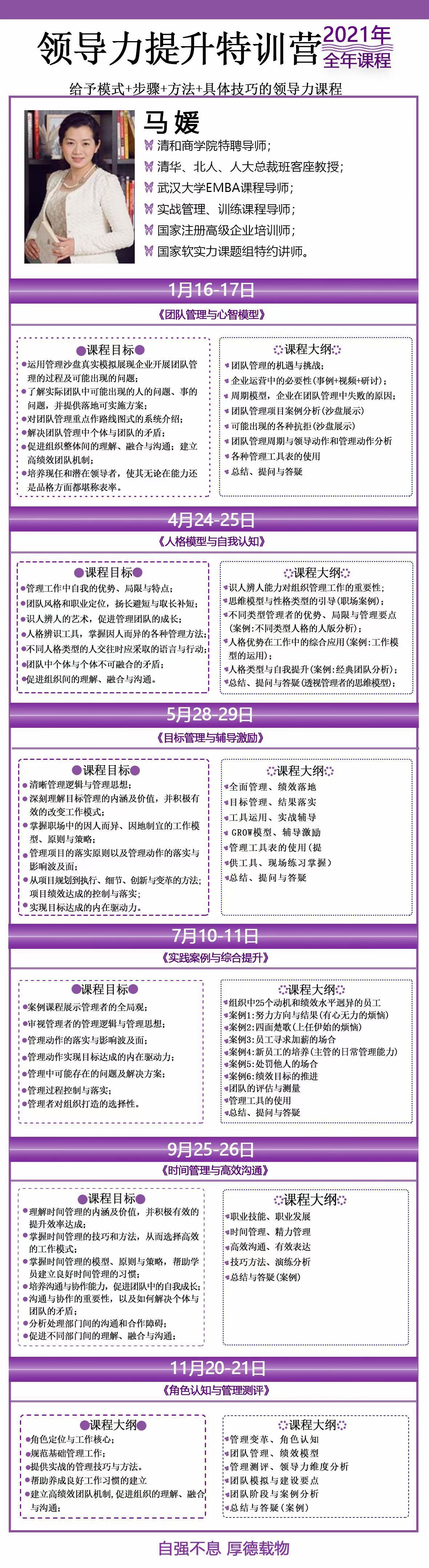 :领导力提升特训营2021年全年课表 《领导力提升特训营》七大系列,费用9800,学制一年,每两个月集中上课2天。 上课地点:清华科技园 课程安排: 1)管理者的团队管理与心智模型 2)管理者的团队凝聚与实践沙盘 1)突出实战~课程结束,可带着工具和方法回到