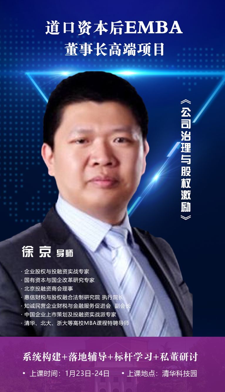 2021年1月23-24日【资本后E】课程导师、中国实战派投融资专家 徐京 主讲《公司治理与股权激励》