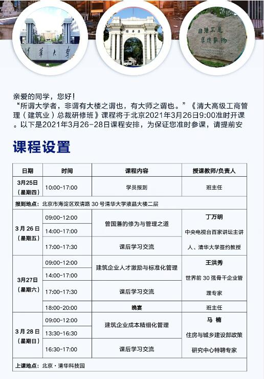 导读:清大建筑业总裁研修班2021年3月开课通知 开课时间:2021年3月26-28日 报道时间:2021年3月25日(星期四10:00-17:00)