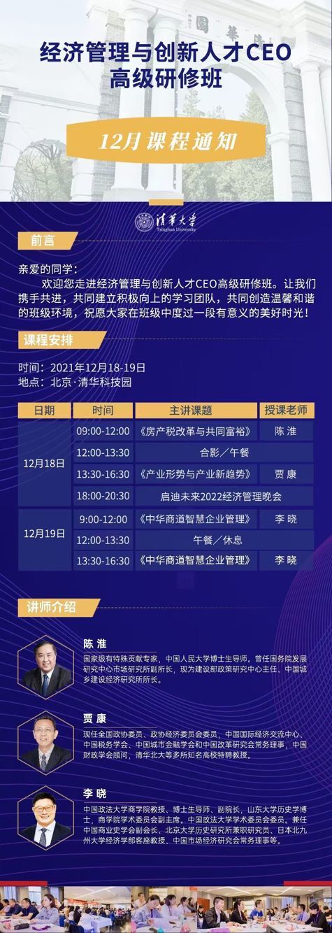 导读:经济管理与创新人才CEO研修班2021年12月开课通知 开课时间:2021年12月18-19日 授课内容:房产税改革与共同富裕、产业形势与产业新趋势、中华商道智慧企业管理