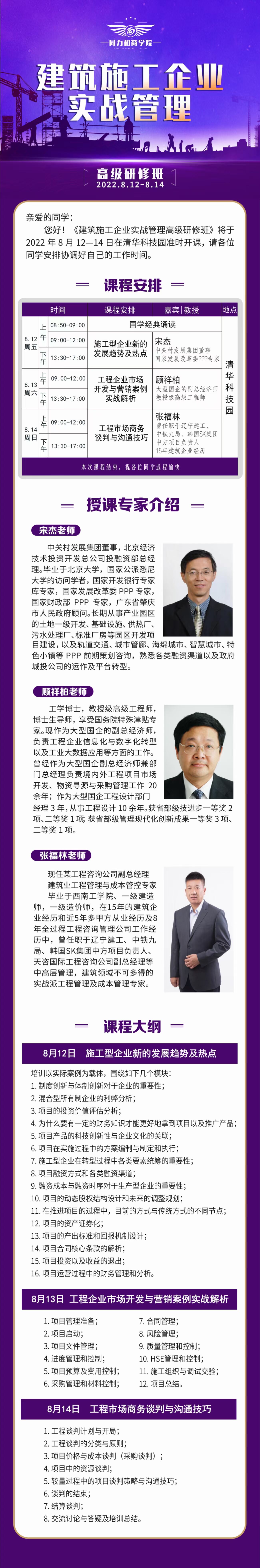 建筑施工企业实战管理高级研修班将于2022年8月12-14日在清华科技园准时开课,请各位同学安排协调好自己的工作时间。