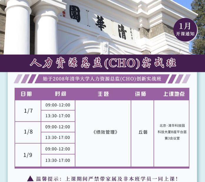 2022年1月7-9日人力资源总监CHO实战班开课通知 《人力资源总监(CHO)实战班》,费用29800,学制一年半,每两个月集中上课2-3天。 上课时间:2022年1月7-9日 上课地点:清华科技园 1、历史:清华、北大独家08年开课至今 2、师资:每门课程2-3位授课老师 3、...