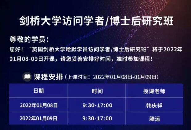 2022年1月剑桥大学哈默顿学院博士后研究国内课程通知 剑桥大学哈默顿学院博士后研究国内课程,于2022年1月8、9日上课,温馨提示如下: 1、请于早上9:00到东升汇酒店一层签到,9:30正式上课; 2、北京现阶段需要48小时核酸,课程资料我们已为您准备好,如有与...