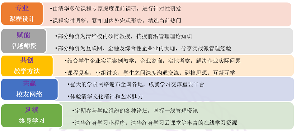 从踏入清华到顺利结业,每个阶段让学员体会卓越的教学管理、知识汲取、同学活动的不同收获。