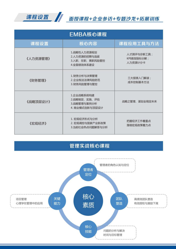 专为高速成长的成功企业的中高层决策和管理者设计。2019年EMBA工商管理课程全面升级,紧密契合企业高层不断升级的学习需求,在全方位提升学员框架理论与综合管理能力的同时,提供一个与学术界、企业界、政府、商界高效沟通、长期交流的平台,帮助企业迅速有效达成目标。